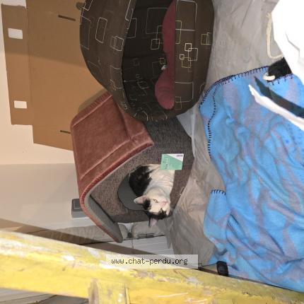 Chat mâle blanc et noir, qui vient autour de la maison et squatte la niche du garage. Relativement timide mais qui aimerait beaucoup s'approcher de l'humain. Il vient tous les jours et mange ce qu'on lui donne.
